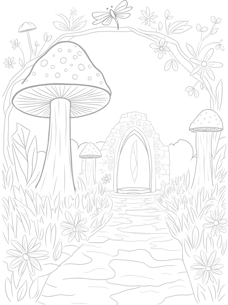Mystical Forest Glade with Giant Mushrooms and a Moonlit Fountain Coloring Page