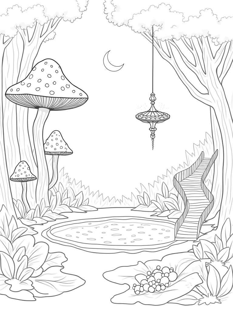 In this enchanting scene, you'll find a magical forest glade filled with towering mushrooms that look like they could be trees! Each mushroom cap is detailed with intricate patterns, just waiting for your favorite colors. Right at the center, a crystal-clear pond reflects the soft light of a crescent moon, creating a serene atmosphere. Wisps of fog swirl around, adding to the mystical feel.