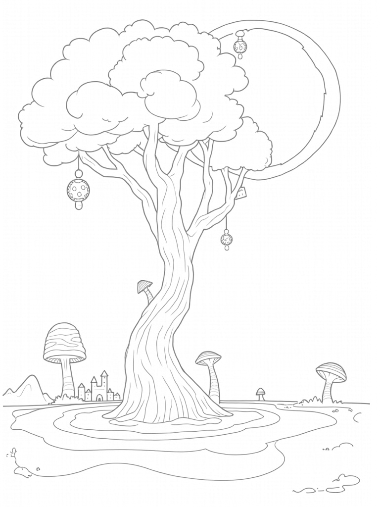 At the base of this magnificent tree, there’s a shimmering pond that reflects all its colors, adding to the enchanting scene. Surrounding the pond are oversized mushrooms with spiraled caps, creating a magical circle. And in the background, you can spot distant mountains peeking through a swirling mist, along with tiny floating islands that hold miniature castles. It’s a fantastical setting that’s perfect for sparking creativity!