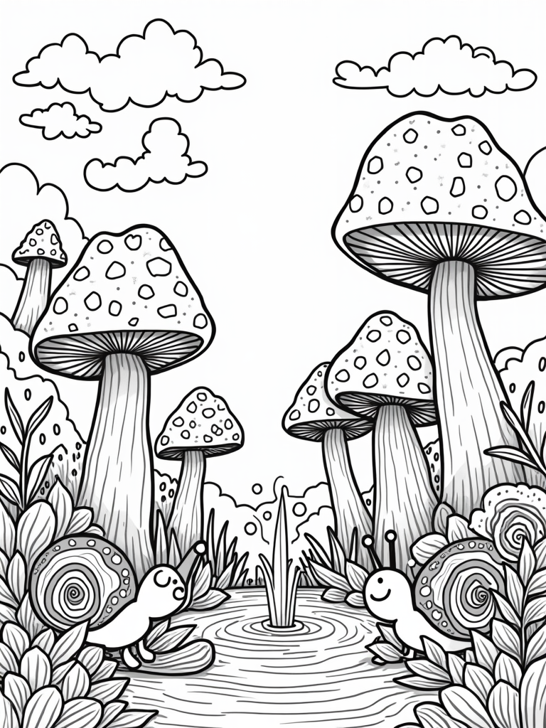But wait, there’s more! Look closely, and you’ll find a giant, friendly snail gliding over a lush carpet of leafy vines. Its shell is a stunning spiral galaxy that invites your imagination to swirl along with it. And don’t forget to peek up at the sky, where fluffy clouds take on the shapes of mythical creatures, drifting lazily by. There’s so much to color and bring to life!