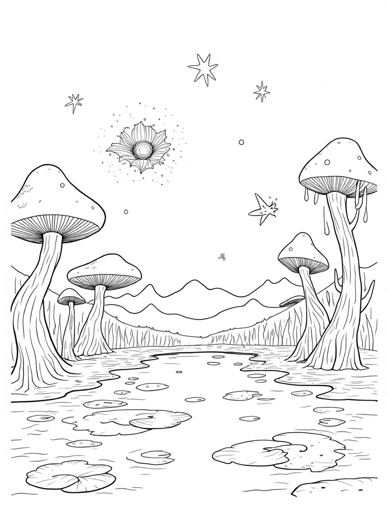 This coloring page shows a magical forest glade filled with giant, twisting mushrooms that look like they could almost reach the clouds! In the center, there's a sparkling pond that reflects the sky like a mirror, surrounded by star-shaped lily pads. It’s a place where you can imagine all sorts of enchanting creatures living just out of sight.