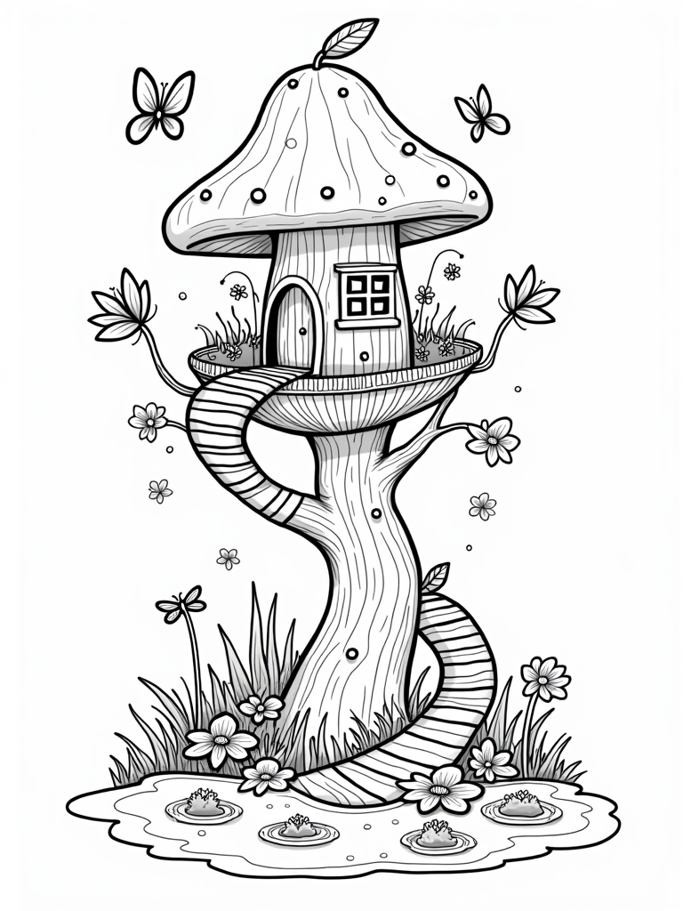 Check out this free, printable coloring page featuring a magical treehouse in a twisted mushroom. Perfect for kids who love fantasy, this coloring page is full of fun details like butterflies, flowers, and a friendly dragonfly!