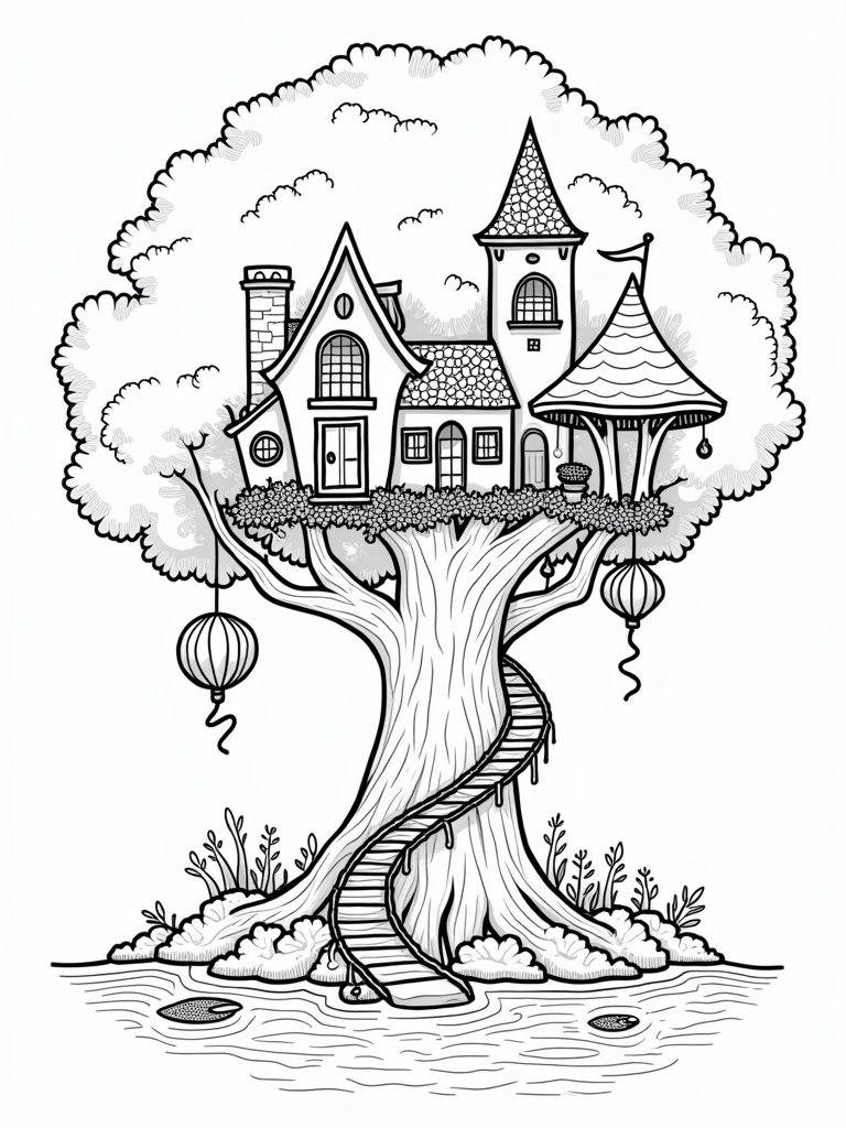 This coloring page showcases a delightful treehouse village nestled high among the branches of a gigantic spiraled tree. Each treehouse has its own unique shape, like a cozy round cottage with a crooked chimney and a tall tower that proudly waves a flag. There's even a fun mushroom-shaped hut with oversized windows, perfect for little critters peeking out!