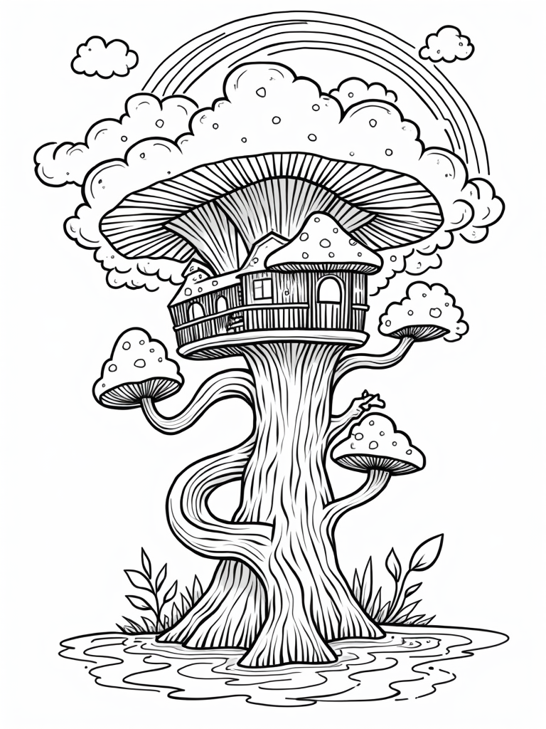 This coloring page shows a delightful treehouse village nestled high in the branches of a giant, spiraling tree. Below, you'll find oversized mushrooms with fun polka dots and stripes, adding a splash of color to the scene. A winding slide made of intertwined vines spirals down from the treehouse, leading to a sparkling stream, perfect for little adventurers.