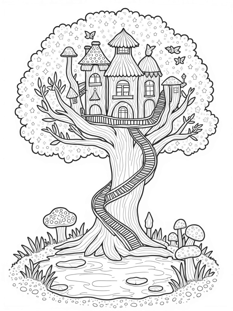 High up in the branches of an ancient, gnarled tree, there's a magical village of treehouses that look like they've come straight from a storybook. Each house has its own unique shape, some with roofs like colorful mushrooms and glowing windows that twinkle like lanterns at night. A winding staircase made of twisting vines connects these cozy homes, while cheerful origami birds flit about in the gentle breeze.