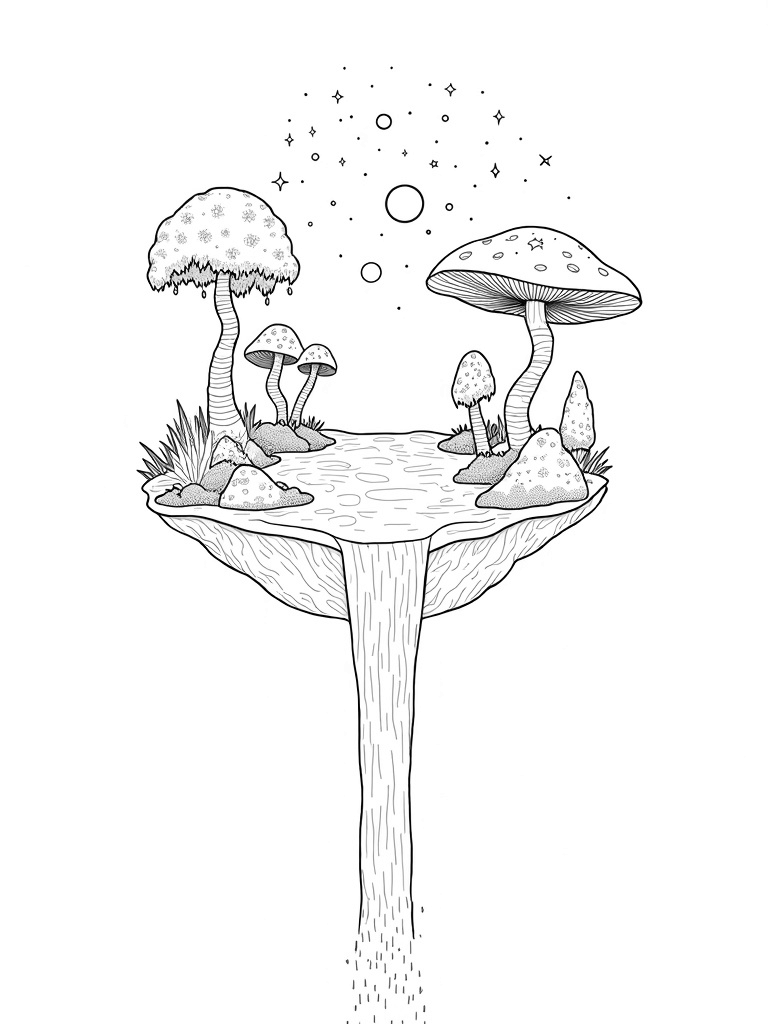 Surrounding the pond are some oversized mushrooms, each decorated with intricate patterns just waiting for your favorite colors. Don't forget to check out the waterfall that tumbles off the edge of the island, transforming into a sparkling stream of stars as it falls into the unknown below. It's a sight that even the most imaginative kids would love to color!