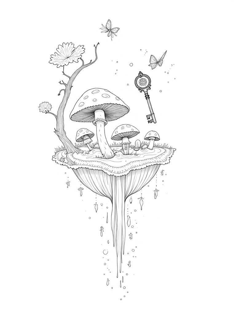 Twilight Floating Island with Mushrooms and Butterflies Coloring Page