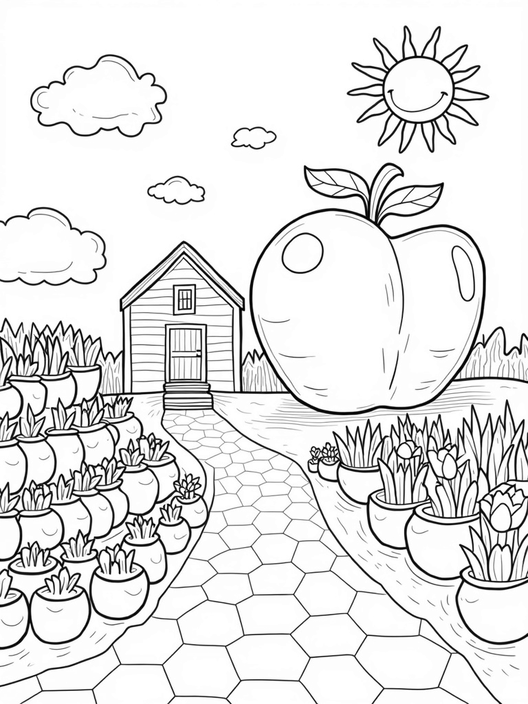 Right in front, there’s a winding path made of oversized hexagonal honeycomb tiles. It leads you to a bunch of colorful flower pots, each one holding unique, abstract blooms. Just think about all the colors you can use to bring those flowers to life. Plus, fluffy clouds in quirky shapes float above, while a happy sun beams down with its wavy rays. What a cheerful sight!