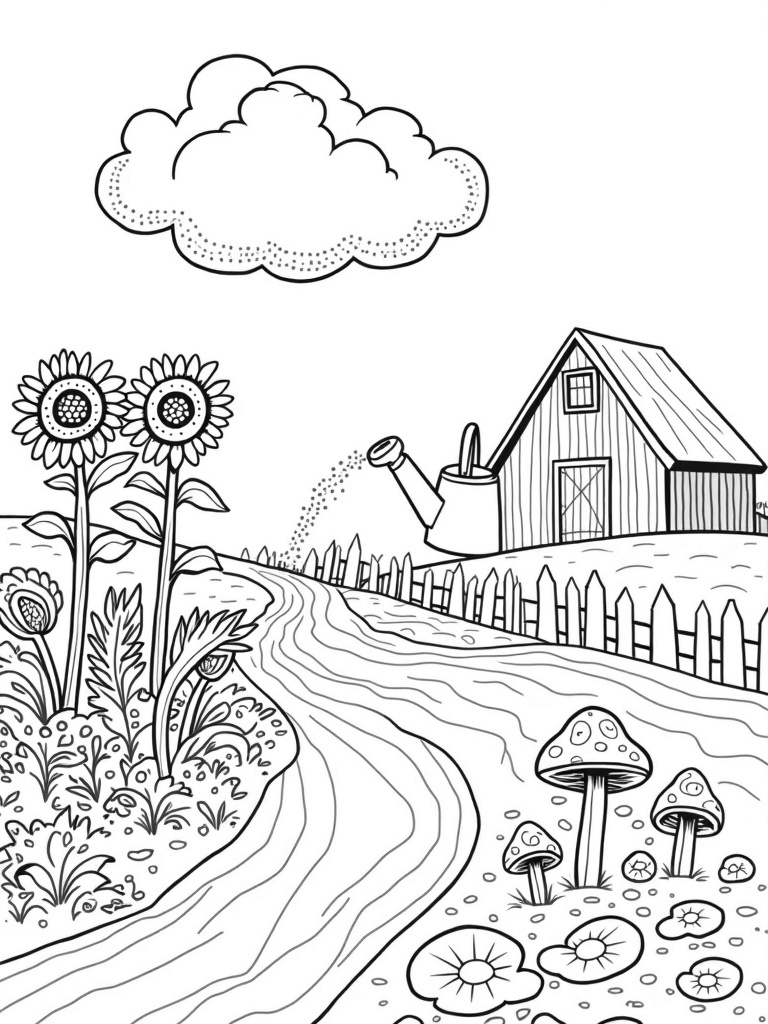The ground is an exciting place, too! A winding path of carrots and radishes spirals through the field, inviting little hands to color it with their favorite shades. Nearby, a giant watering can is spilling water, creating a small pond with pretty lily pads. It’s a perfect spot for some imaginative coloring!