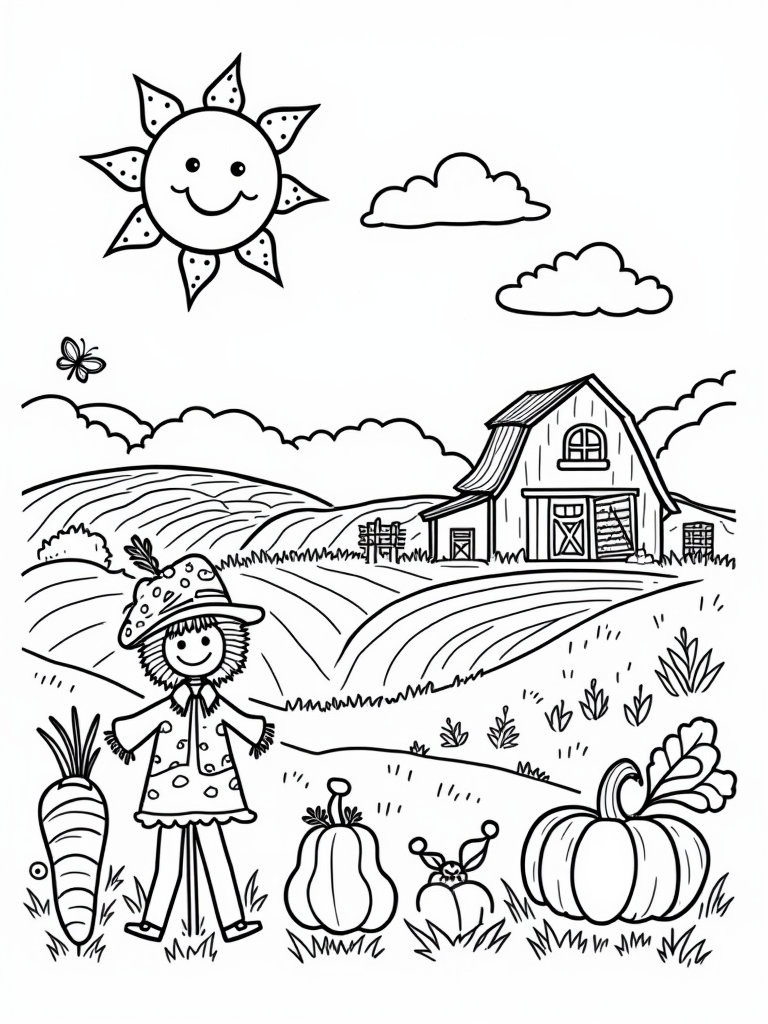 Cheerful Farmyard with a Smiling Sun and Playful Scarecrow Coloring Page
