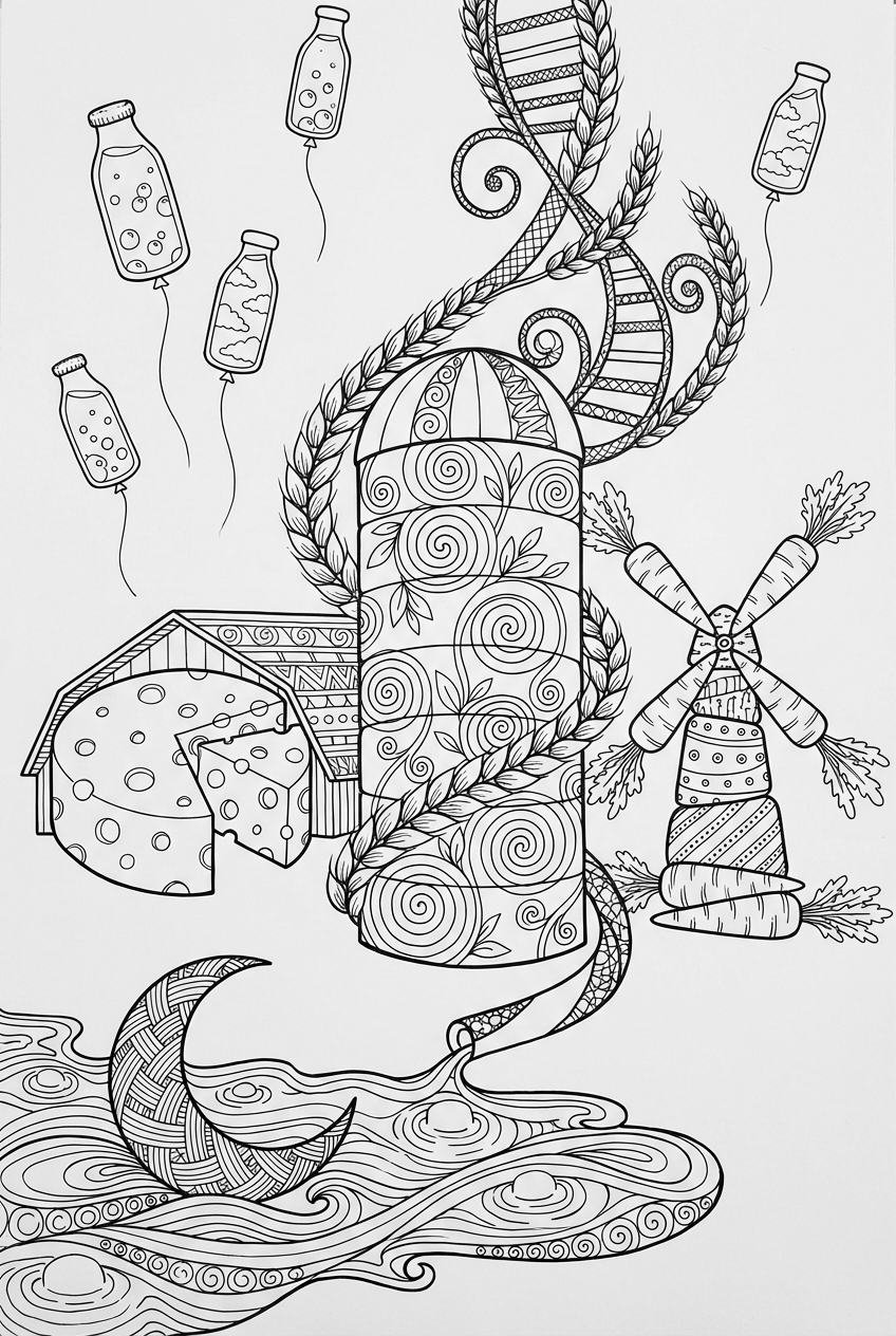 Take a look at this quirky farm scene: a towering silo with wheat vines that twist into spiral ladders, a barn roof turned into a giant cheese wheel, and a buttery pond that mirrors a hay moon. Oversized carrots form a windmill, while milk bottles drift above like colorful balloons. All drawn in clean, Zentangle‑style ink, the lines are crisp and the spaces are generous for easy coloring.