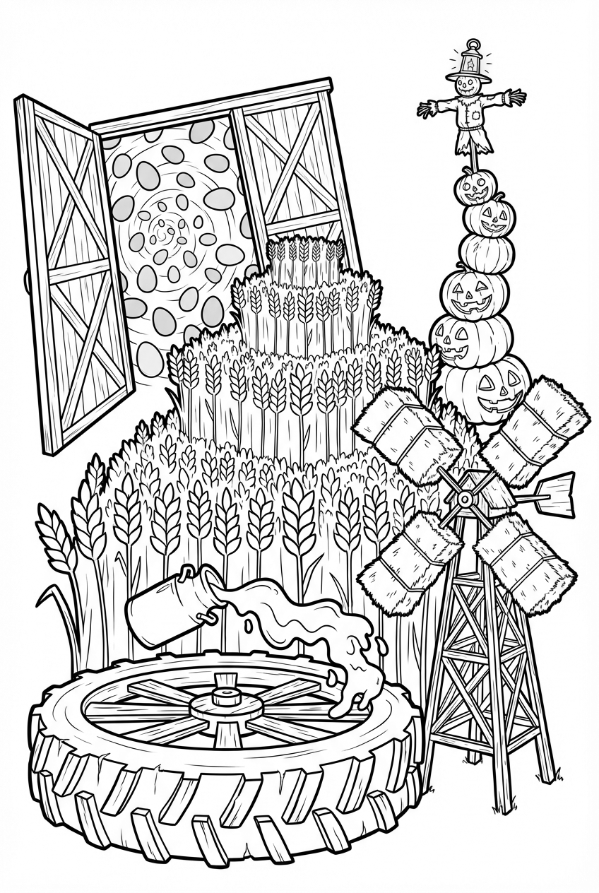 Did you know that real scarecrows were originally made from old clothes and straw to keep birds away? And windmills used to grind grain, not spin hay bales. Kids love spotting the hidden details, like the swirling eggs or the milk river, so keep an eye out while you color.