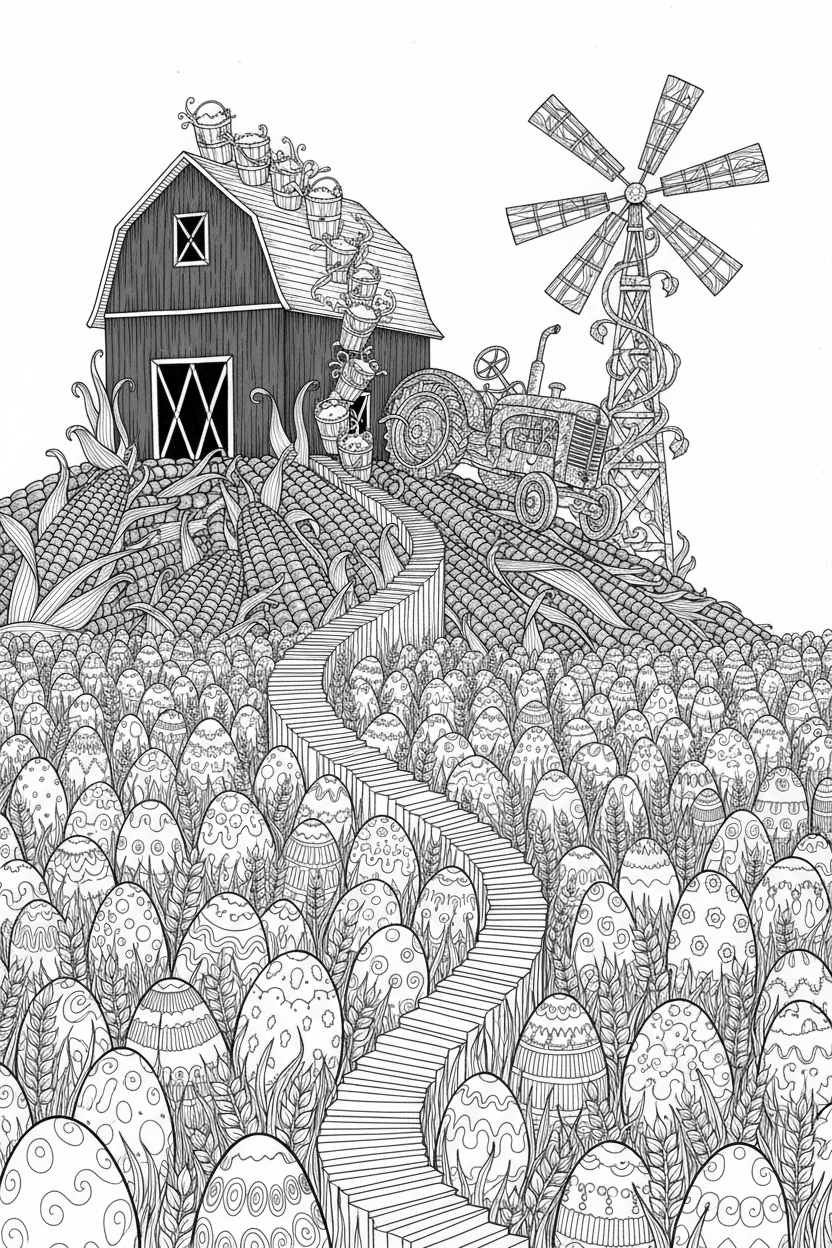 Look at that lively farm scene: a bright red barn perched on a mound of golden corn cobs, a rusty old tractor snaking its way around a windmill that's wrapped in playful vines. The buckets of milk swirl up like a ribbon staircase, and a bunch of oversized white eggs are rolling over a sea of tall wheat stalks. Every line is crisp and ready for a splash of colour, so you can let your imagination run wild on each little detail.