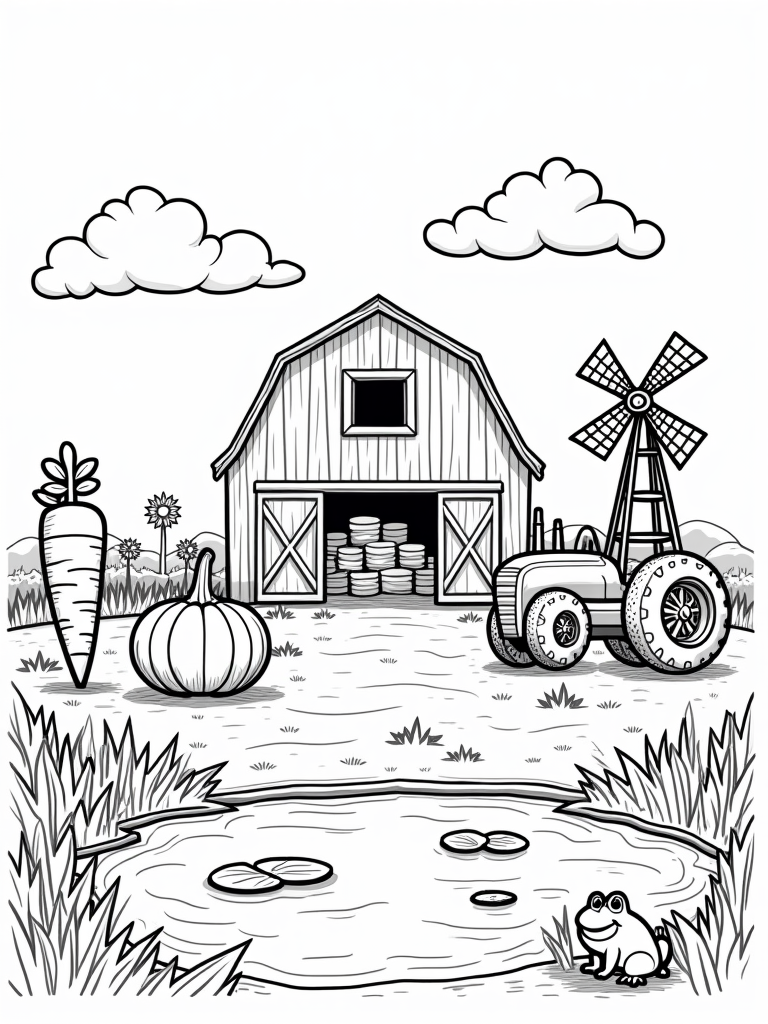 This lively farm scene is all about fun! At the center, there's a huge barn with its doors wide open, showing off stacks of hay bales inside. Just next to it, a cheerful windmill spins slowly, its colorful blades adding a pop of brightness. Can you spot the row of oversized vegetables? There’s a smiling carrot and a happy pumpkin lining the path to the barn, making the whole scene feel extra friendly!