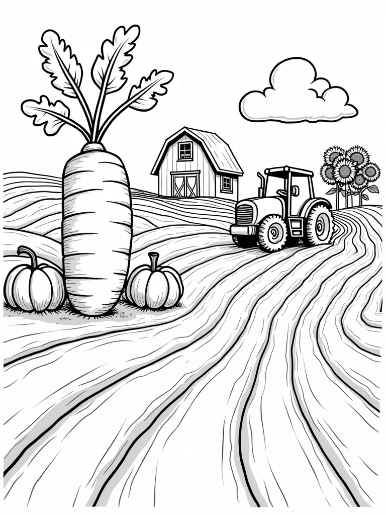 Look closely, and you’ll see a friendly tractor with oversized wheels rolling through a field of sunflowers, their cheery faces all turned toward the sun. Scattered around are some playful oversized veggies, including a smiling pumpkin and a cheeky zucchini, adding extra bursts of fun to this peaceful rural landscape. It’s a perfect scene for little artists to bring to life with colors!