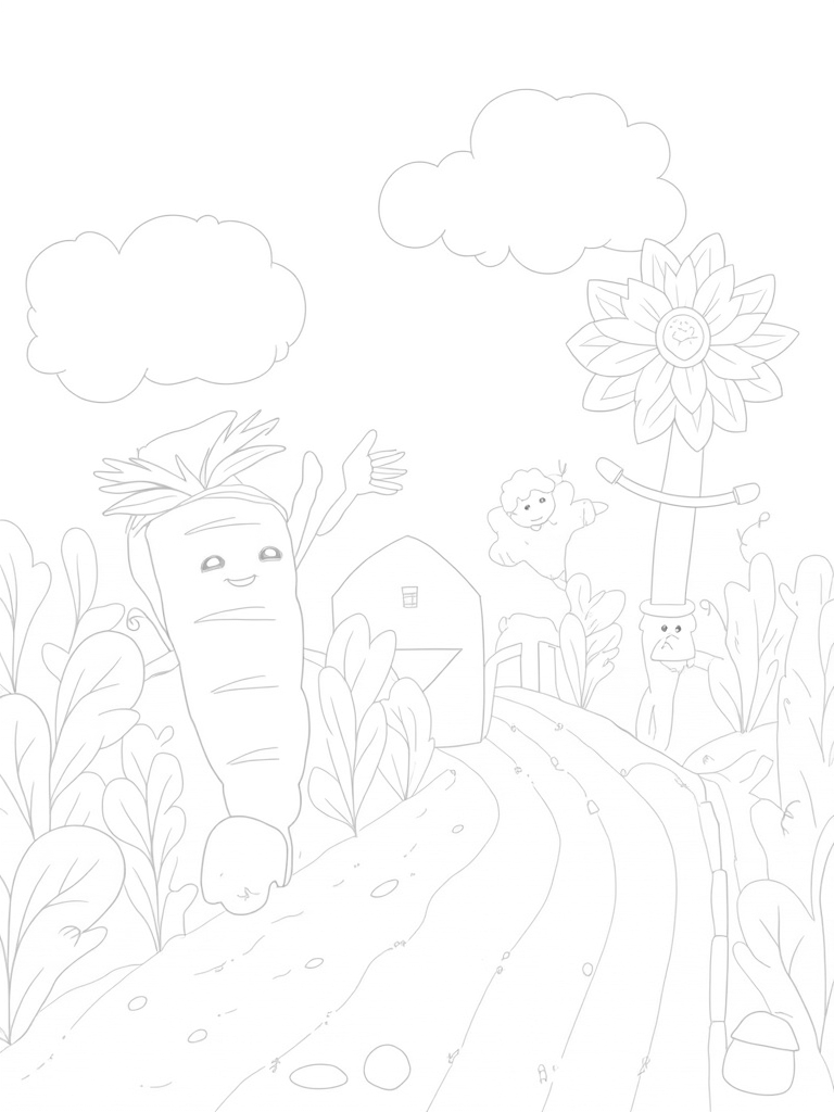 In this delightful farm scene, a giant carrot wearing a straw hat stands proudly among rows of leafy greens. Just nearby, a winding path made of colorful stones leads to a barn shaped like a big, cheerful apple with a smiling door. Isn't that fun? Above, fluffy clouds shaped like cows, pigs, and chickens float by, making the sky feel extra lively!