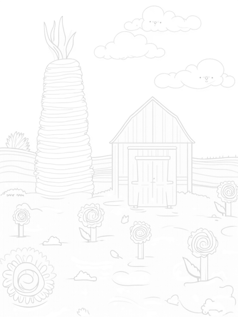 This coloring page showcases a delightful farm landscape where a giant, spiraling carrot stands tall like a lighthouse. Imagine how fun it would be to see this carrot in real life! Nearby, oversized mushrooms with cool patterns create colorful stepping stones that lead right up to a barn shaped like a friendly barn owl. It’s like something straight out of a storybook!