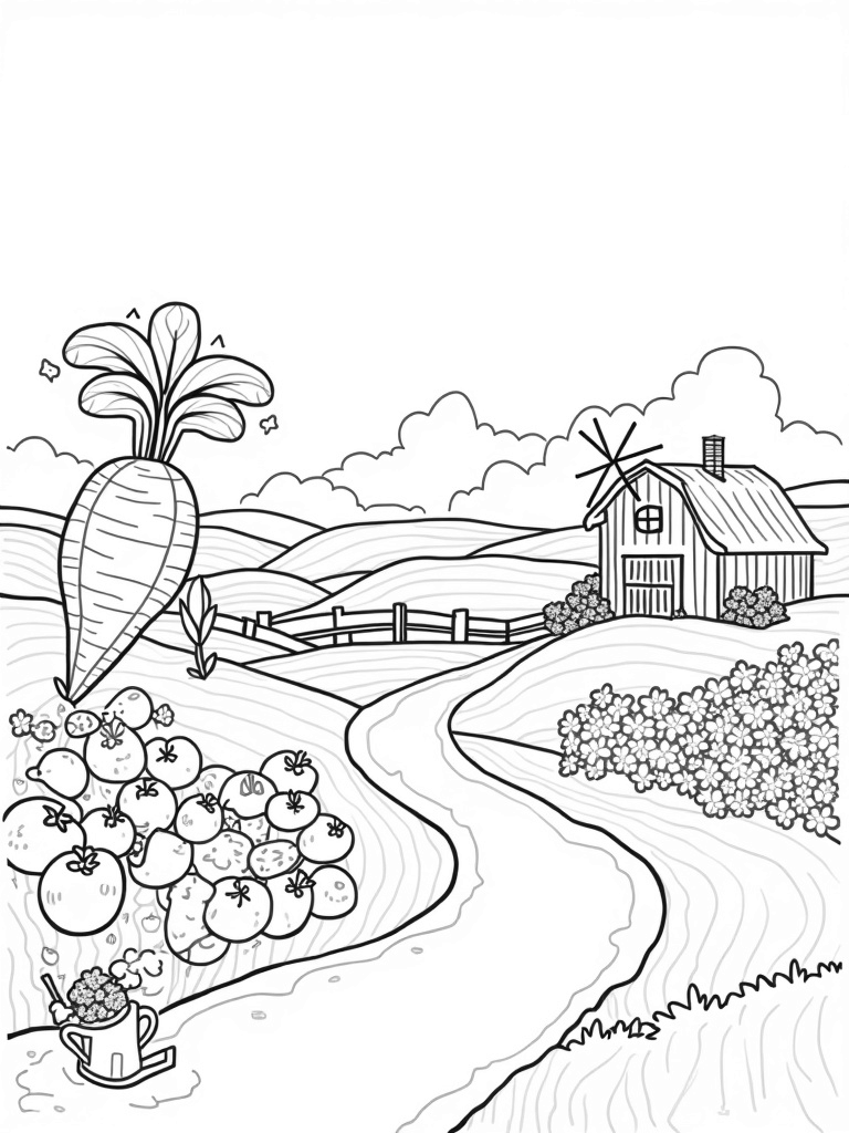 Giant Carrot and Tomato Farm Landscape Coloring Page