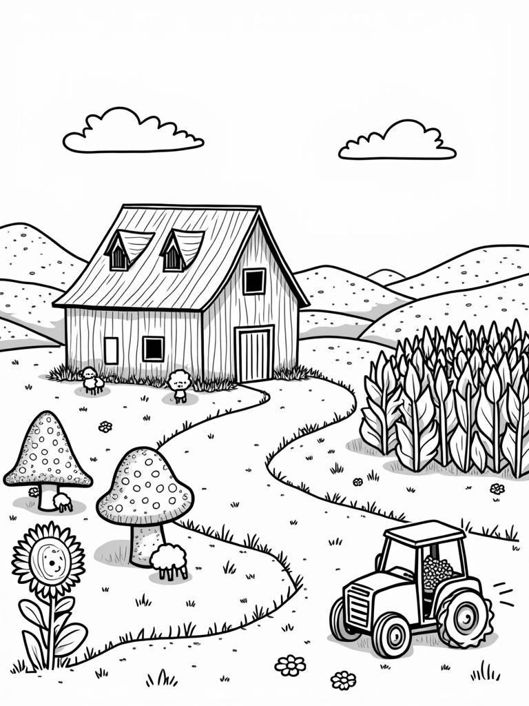 This delightful farm scene centers around a giant carrot-shaped barn, complete with a colorful roof dotted with birdhouses! Surrounding the barn, a winding path of corn stalks leads you to a circular patch of oversized mushrooms, each cap resembling a different farm animal. It’s a charming mix of nature and imagination!