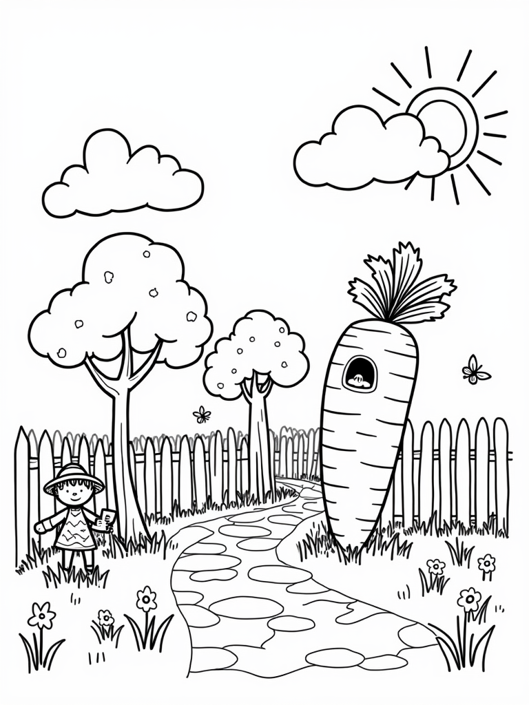 Enjoy this free, printable coloring page featuring a whimsical farm with a giant carrot house and a friendly scarecrow. Perfect for kids who love farm themes and oversized veggies!