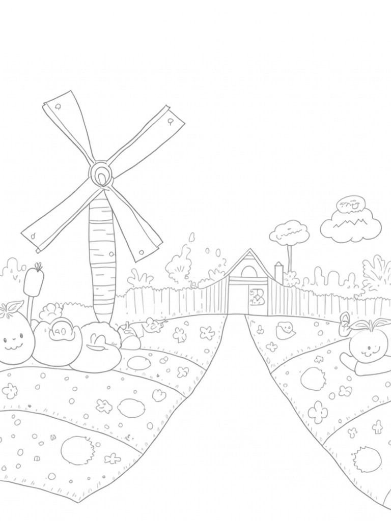 This coloring page shows a delightful farm scene filled with fun details. In the foreground, there's a giant windmill shaped like a carrot, spinning gently with colorful flowers on its blades. Just beside it, you'll spot a patchwork of fields with oversized vegetables, all sporting cheerful smiles! It’s a place where imagination runs wild.