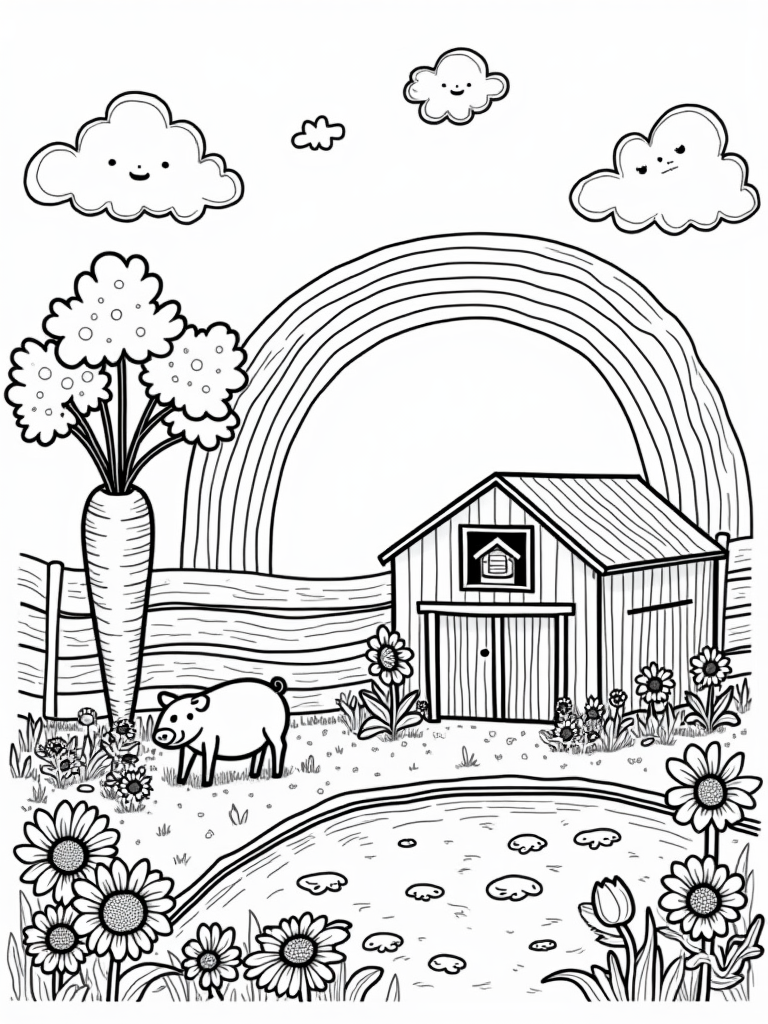 This scene is bursting with fun! Picture a farm where giant carrots grow like trees, their leafy tops dancing in the gentle breeze. Nearby, there’s a cheerful barn made of candy-striped wood that looks good enough to eat! Surrounding the barn are oversized flowers, just waiting to be colored in all sorts of bright hues. And look! A curious little piglet peeks out from behind a patch of big, smiling sunflowers, ready to say hello!