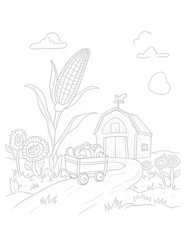 This page showcases a delightful farm landscape dominated by a towering corn stalk that spirals up into the sky. At the base, you’ll find enormous sunflowers with lots of fun petal designs, all surrounding a wooden cart brimming with plump, cartoonish vegetables. It's like a farmer's dream come to life!