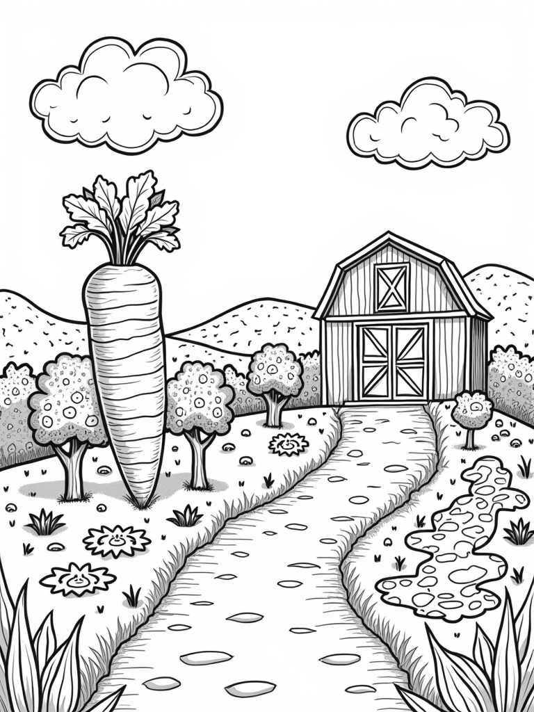 Imagine a farm where everything is a little bit bigger and a lot more fun! In this delightful scene, giant fruits and vegetables tower like trees. There’s a friendly carrot standing tall with its leafy greens dancing in the breeze. Right next to it is a barn that looks like a juicy slice of watermelon, bursting with colors and patterns that make it hard not to smile.