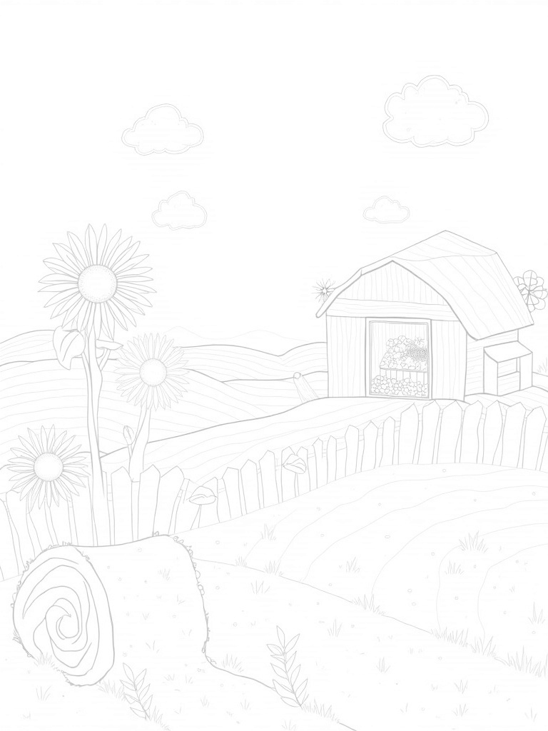 Check out this free, printable coloring page featuring a delightful farm scene with giant sunflowers, a rolling hay bale, and a classic red barn. Perfect for kids who love to color and explore the farm category!