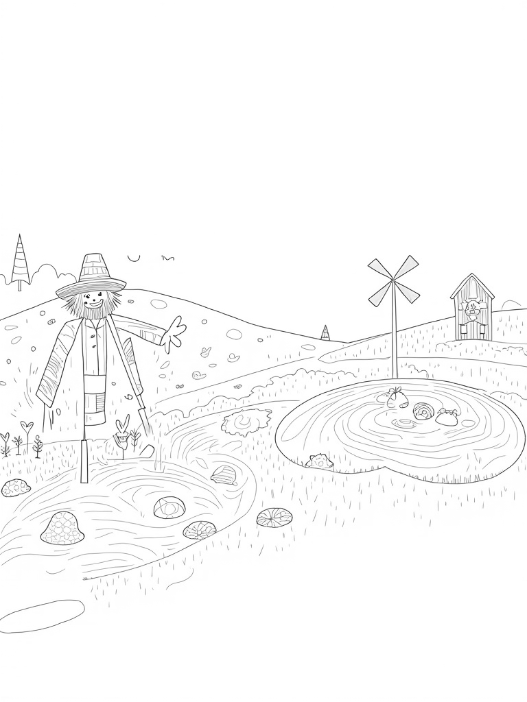 You’ll find a delightful farm landscape filled with quirky elements! The giant, twisted vegetable garden is a standout, where carrots and radishes sprout from huge, interlocking gears. A tall scarecrow with a colorful patchwork hat keeps watch over a field that's swirling with fun patterns. Not too far away, a windmill made of bright flower petals spins gently in the breeze, adding a touch of magic to the scene.