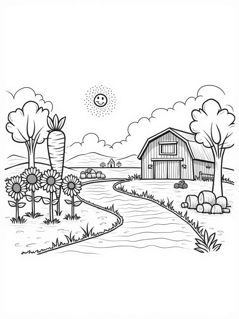 Discover this free, printable coloring page featuring a playful farm landscape with giant vegetables, a carrot barn, and butterflies! It's perfect for kids who love to color and explore whimsical scenes.