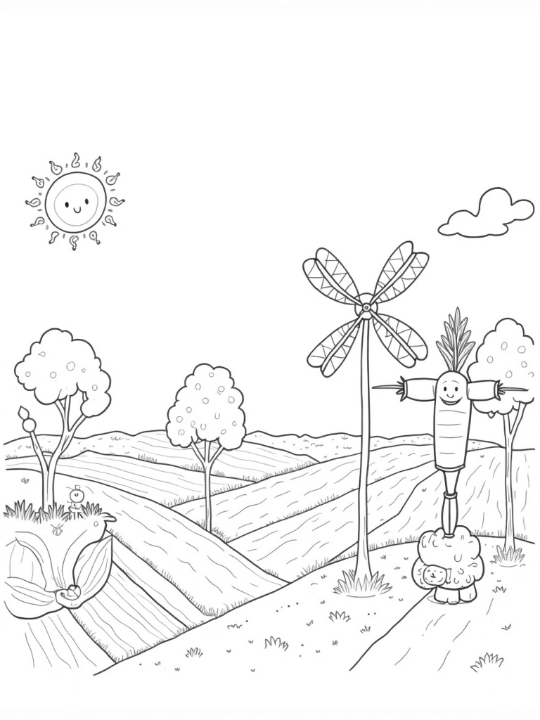 Imagine a farm where everything is just a little bit bigger and a whole lot more fun! In this coloring page, you’ll find giant vegetables that look like they’ve popped out of a storybook. Carrots grow tall like trees, and their roots twist and turn below the surface. A whimsical windmill shaped like a giant carrot spins happily in the foreground, its colorful blades bringing a splash of joy to the scene.