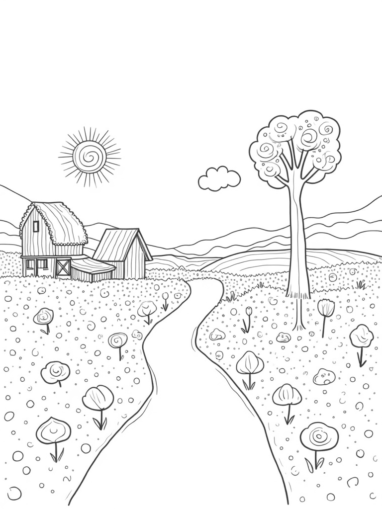 In the foreground, there’s a charming barn with a thatched roof that looks like a cozy cottage. It’s the perfect spot for all the farm animals! Nearby, a windmill spins slowly, adding a touch of magic to the scene. And don’t forget about the big sun with its swirling rays hanging low in the sky, casting a warm glow over this delightful landscape.