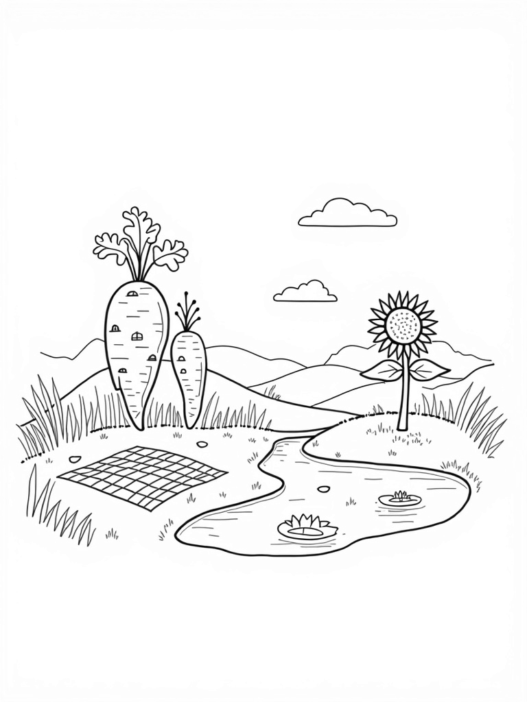 This scene is bursting with imagination! You’ve got a towering carrot standing proud next to a spiraling potato hill that looks like it could be a cozy little house. Tiny windows and roofs make it feel like a magical place where veggies can live. And check out that oversized sunflower in the foreground! It's so big it’s acting like an umbrella for a colorful patchwork quilt spread out on the grass. Perfect for a picnic, right?