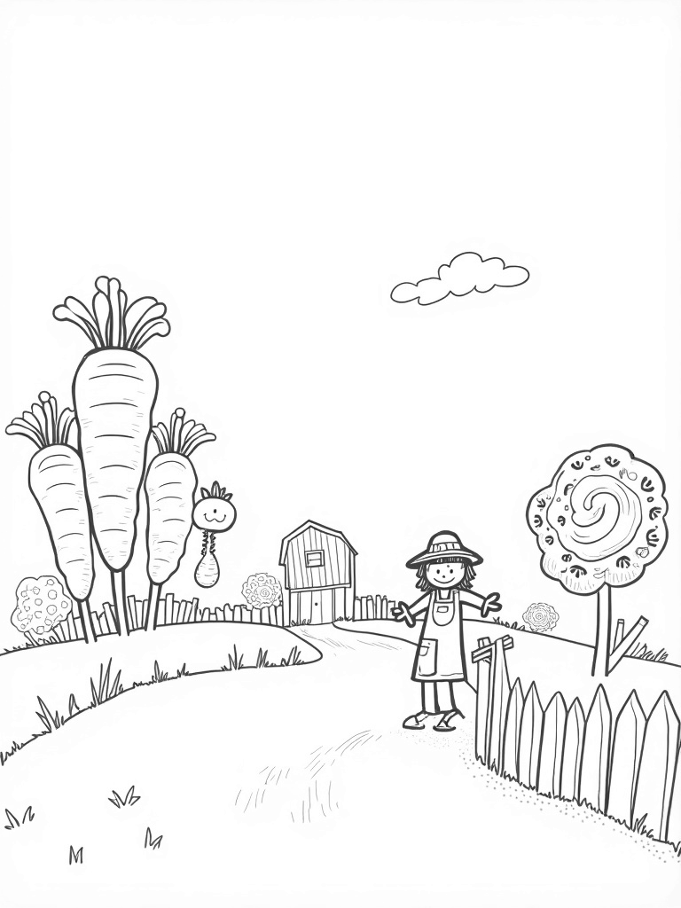 Grab your crayons and let your imagination run wild! You can color the carrots bright orange, the tomatoes a juicy red, and maybe even give the scarecrow a funky look. The butterflies can be any color you love. This coloring page is all about having fun and being creative, so there are no wrong choices!