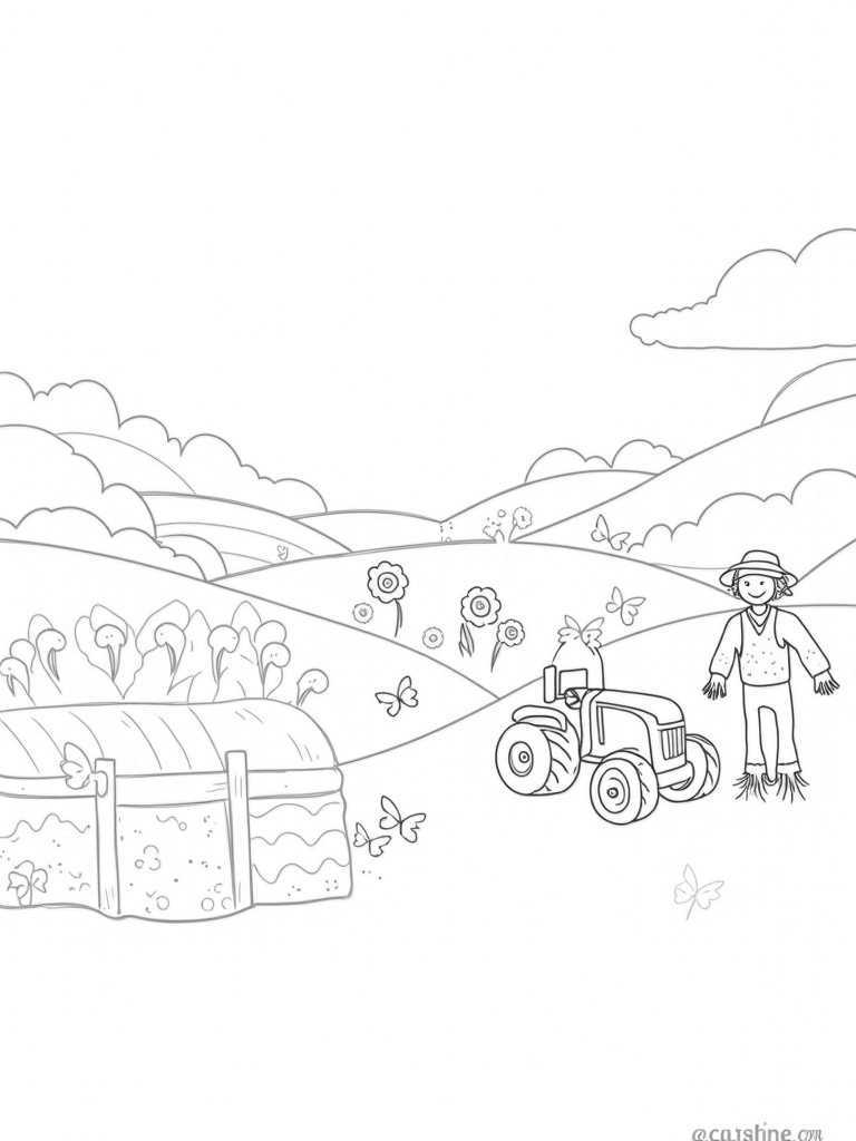 Check out this free, printable coloring page featuring a whimsical farm landscape with giant vegetables and a cheerful scarecrow. Perfect for kids who love to color, it's a fun way to bring a little farm charm to your day!