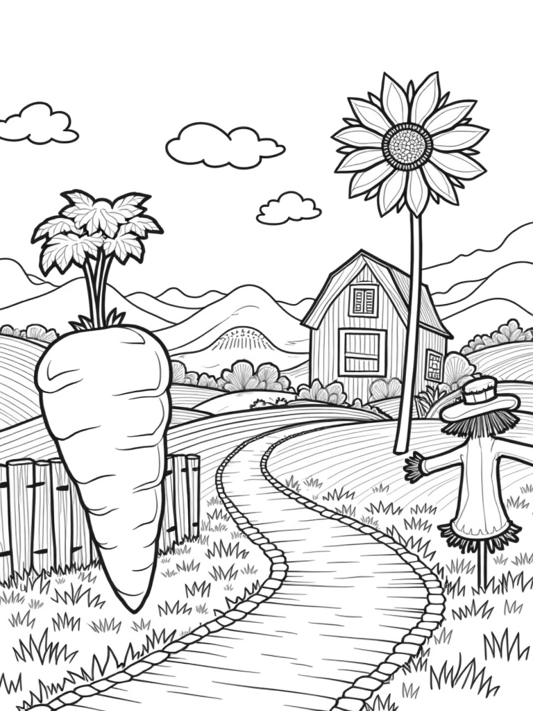 This free, printable coloring page features a whimsical farm landscape with giant vegetables, a sunflower barn, and fun clouds shaped like animals. Perfect for kids who love to color and explore their creativity!