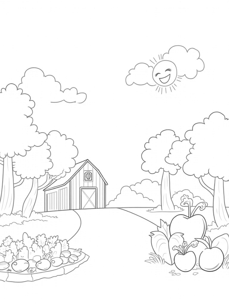 Get ready for a free, printable coloring page featuring a whimsical farm with giant vegetables and an apple-shaped barn! Kids will love bringing this fun scene to life with their favorite colors.