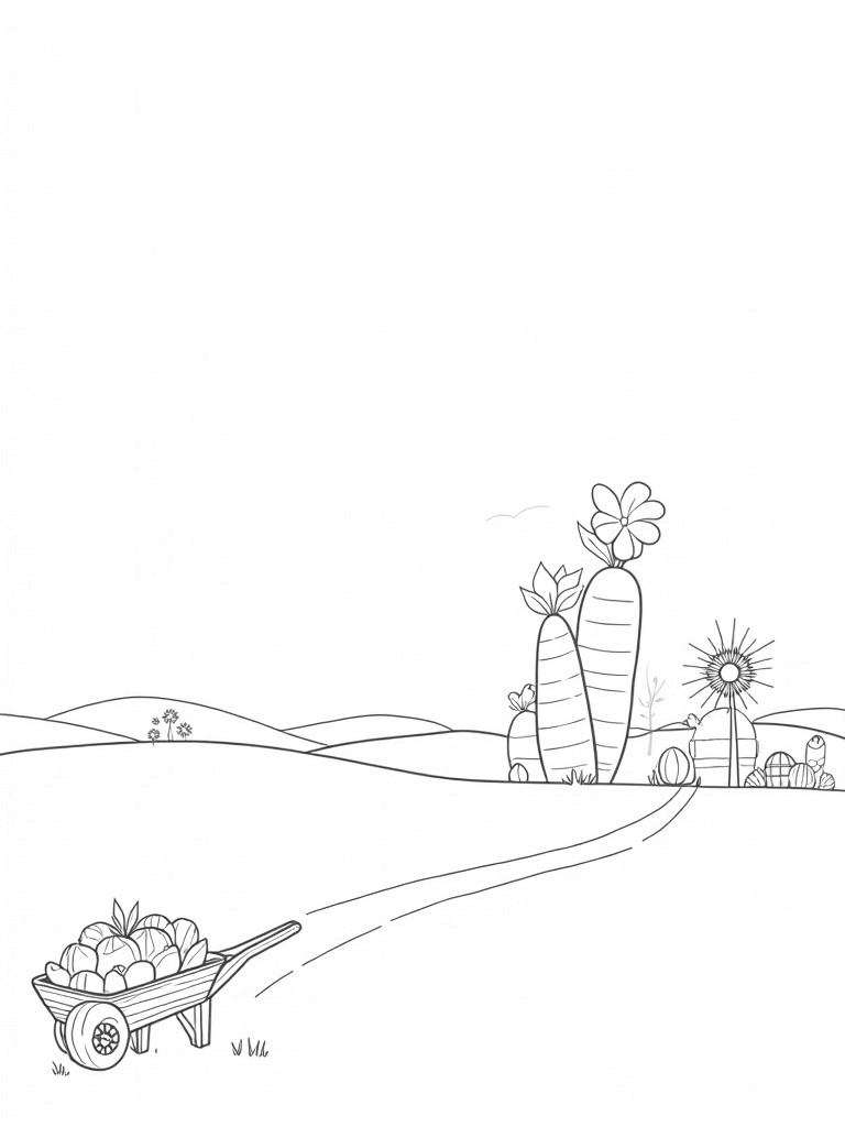 This scene is all about a fun, quirky farm where vegetables grow like trees! Imagine giant carrots with big, leafy tops standing tall over a winding dirt path. You’ve got colossal tomatoes bursting with colors that’ll make your crayons sing. And right in front, there's a rustic wooden wheelbarrow filled with colorful eggs—some are even speckled and striped, just waiting for your creative touch!