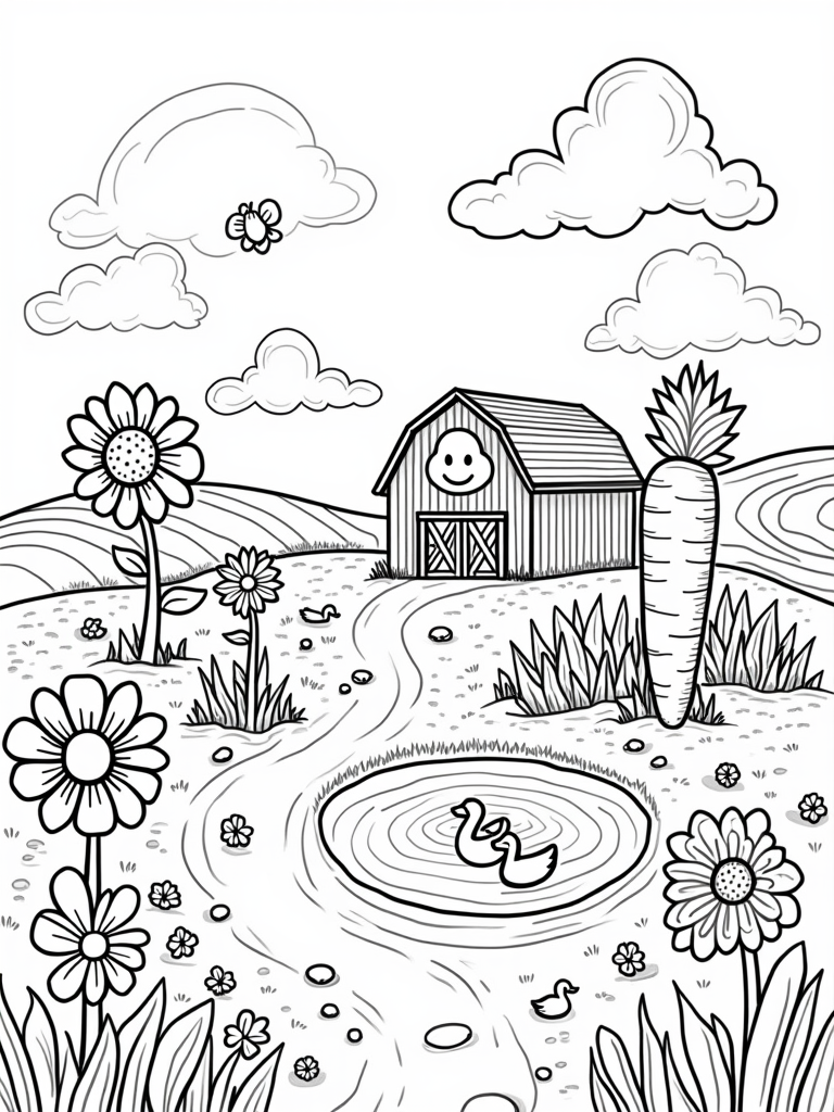 You’ll find a fun farm landscape where enormous, colorful vegetables pop up from soft, rolling hills. Right at the heart of it is a friendly barn with a big, cheerful smile. Surrounding the barn are towering sunflowers that look like they could be tree-sized! There’s a winding dirt path that leads to a cute pond shaped like a carrot, where adorable ducks are happily swimming in circles.