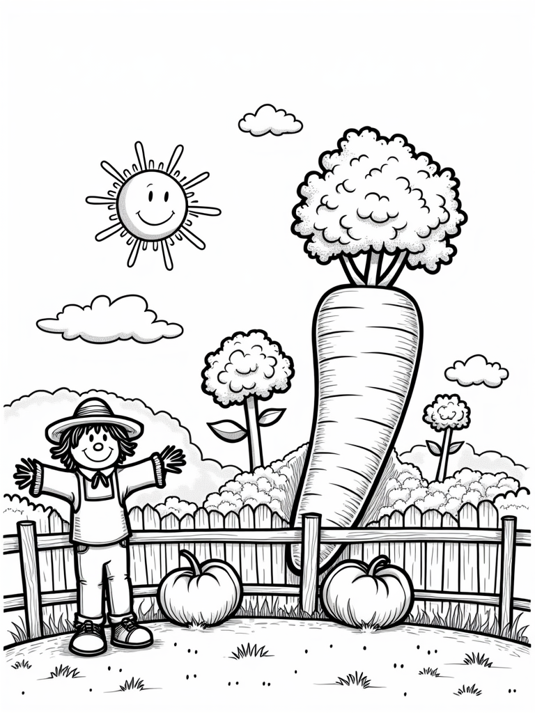 Check out this free, printable coloring page featuring a whimsical farm with giant vegetables, a friendly scarecrow, and a smiling sun. Perfect for kids who love to color and explore the fun side of farming!
