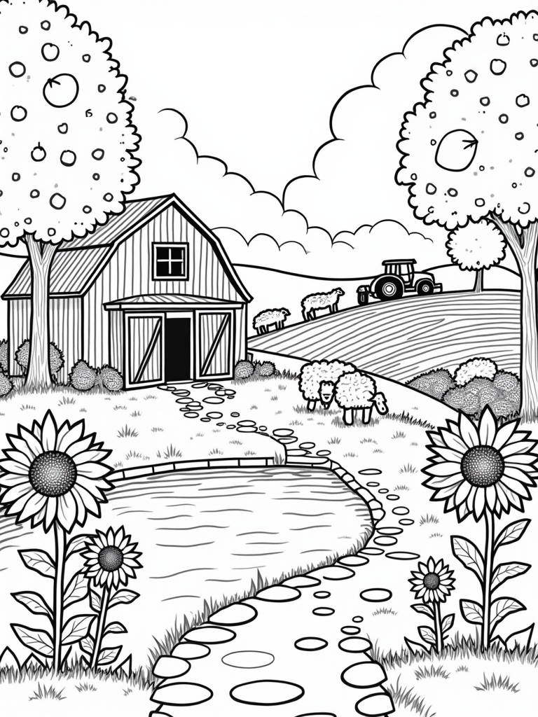 Don’t forget about the friendly scarecrow! Wearing a patchwork hat and standing proudly among giant sunflowers, it adds a touch of whimsy to the landscape. The winding path made of colorful stones not only leads to the scarecrow but also invites you to imagine walking through this delightful farm. And guess what? In the background, fluffy sheep are munching on grass while a bright yellow tractor is parked near a field of carrots and radishes. So much to color!