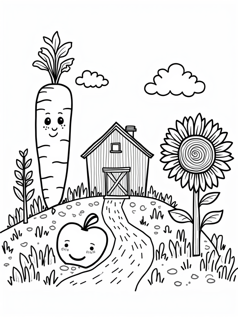 Picture a delightful farm where everything is just a bit larger than life! A giant carrot stands tall like a lighthouse, and you can’t help but smile as a cheerful apple rolls down a grassy hill. Nearby, a bright sunflower with a spiral center keeps watch over a tiny barn that looks like a candy store. It's a scene that combines the magic of nature with a sprinkle of fun!