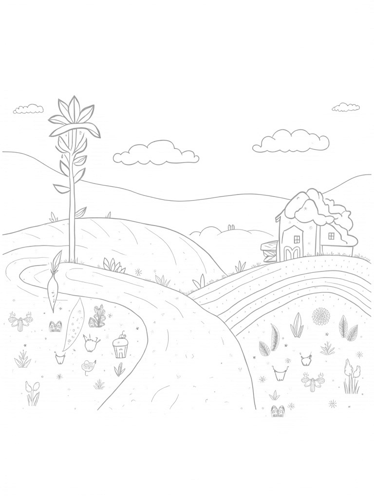 In the foreground, you'll find a colorful patchwork of fields, each one dressed in funky patterns like stripes and polka dots. It's like nature's own quilt! As you color, think about how each section could represent a different yummy vegetable or fruit. Let your imagination run wild while you fill these fields with bright colors.