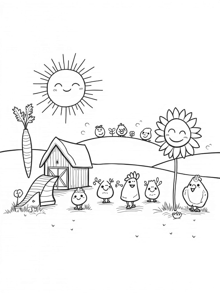 Imagine a farm where the vegetables are so big they could be playgrounds! In this scene, a quaint barn sits snugly under a smiling sun that has rays curling like spaghetti. Look closely, and you’ll spot a giant carrot that’s become a slide for kids to zoom down. Nearby, colorful chickens are busy pecking at the soil under a tall, sunny sunflower, adding a splash of life to the scene.