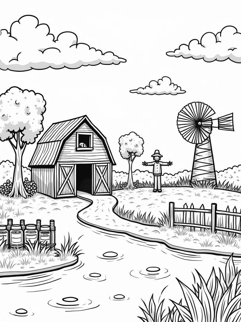 To the right, a whimsical carrot-shaped windmill spins gently in the breeze, while a friendly scarecrow leans against a fence made of twisting vines. It’s as if he’s keeping an eye on the giant veggies! And don’t miss the tranquil pond nearby, where fluffy clouds float peacefully on the water’s surface, just waiting for your crayons to bring them to life.