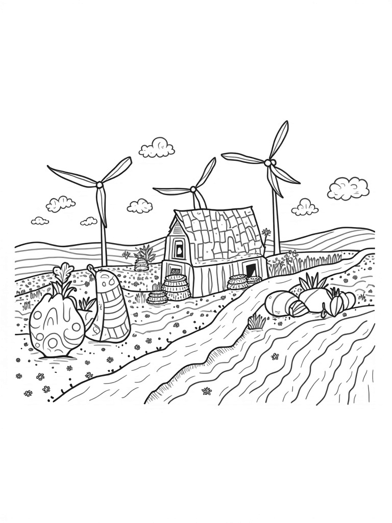 Above this cheerful scene, golden wind turbines are spinning slowly, adding a touch of whimsy. Fluffy clouds drift lazily by, making the sky feel extra dreamy. As you color, follow the winding dirt path lined with scattered flowers leading to a quirky oversized watering can. This can is pouring out rainbows onto the soil, just waiting for your colorful touch!