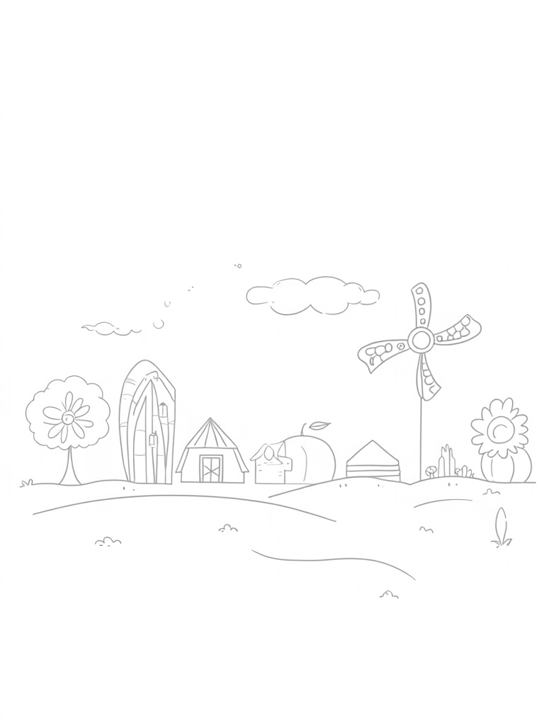 Look up, and you'll spot fluffy clouds shaped like barn animals just floating around in a bright blue sky. It’s like they’re having their own little farm fun up there! And in the distance, a colorful windmill spins gracefully, adding to the cheerful scene. This page is sure to spark creativity!