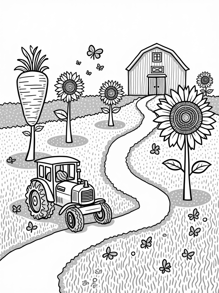 In this delightful farm scene, you'll find oversized vegetables sprouting like trees! Imagine walking down a winding carrot-shaped path that leads you to a barn shaped like a giant red apple, complete with a leafy roof and windows that look like seeds. It’s a magical place where sunflowers stand tall with spiral centers and intricate petal patterns, adding a splash of color to the landscape.