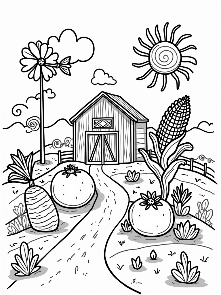 Check out this free, printable coloring page featuring oversized vegetables and a rustic barn. Perfect for kids who love farm themes, it's a fun way to spark creativity and imagination while coloring!